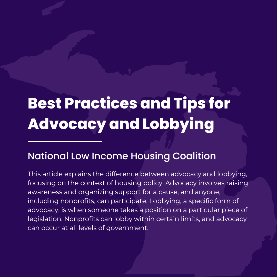 This article explains the difference between advocacy and lobbying, focusing on the context of housing policy. Advocacy involves raising awareness and organizing support for a cause, and anyone, including nonprofits, can participate. Lobbying, a specific form of advocacy, is when someone takes a position on a particular piece of legislation. Nonprofits can lobby within certain limits, and advocacy can occur at all levels of government.